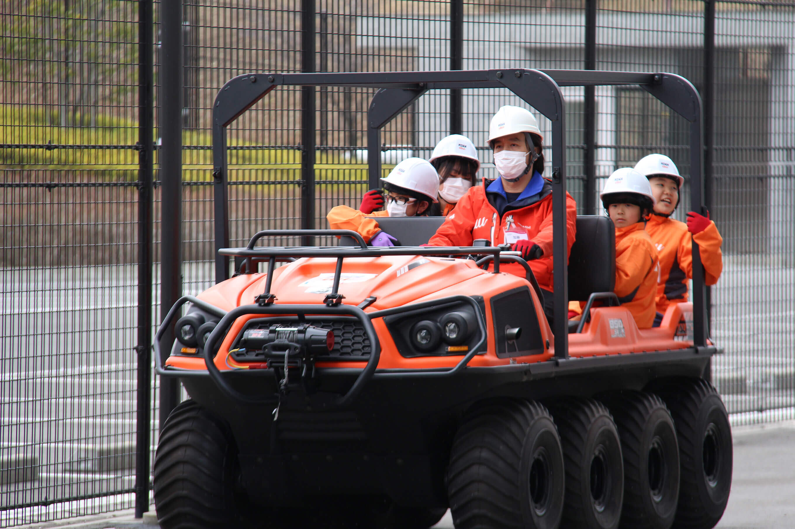 避難所に駆けつけて被災者に電源や無線LANを提供します。避難所への道は水没している想定で、水陸両用車で現地に向かいます。