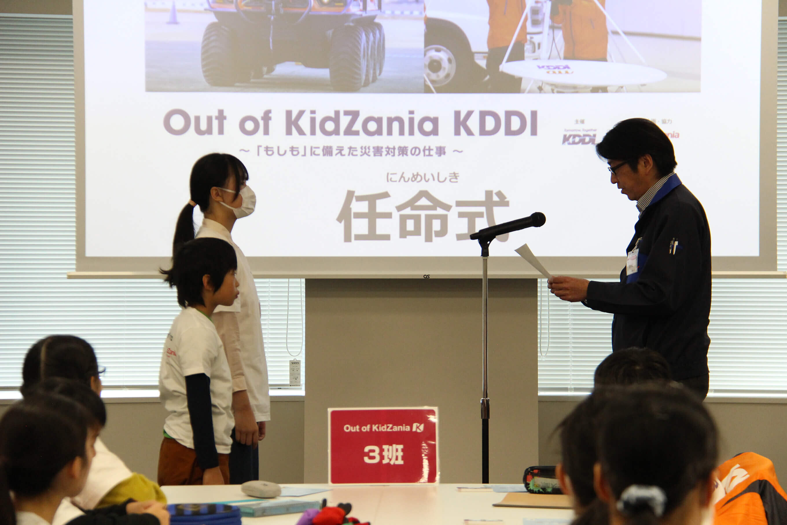 まず「任命式」を行い、災害対策本部長から代表者に「KDDI株式会社 災害対策本部のキッズスタッフ」としての任命書が手渡されました。