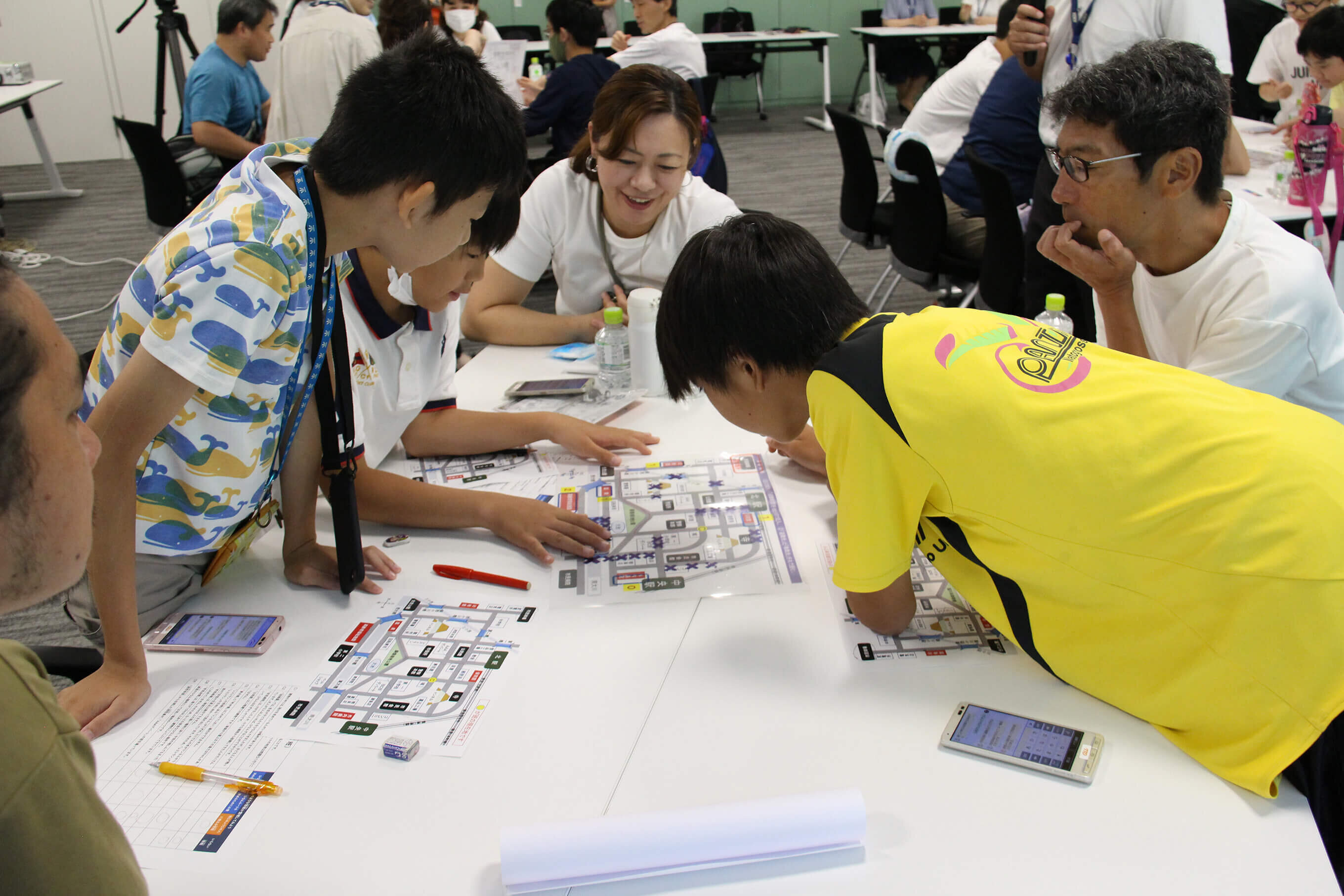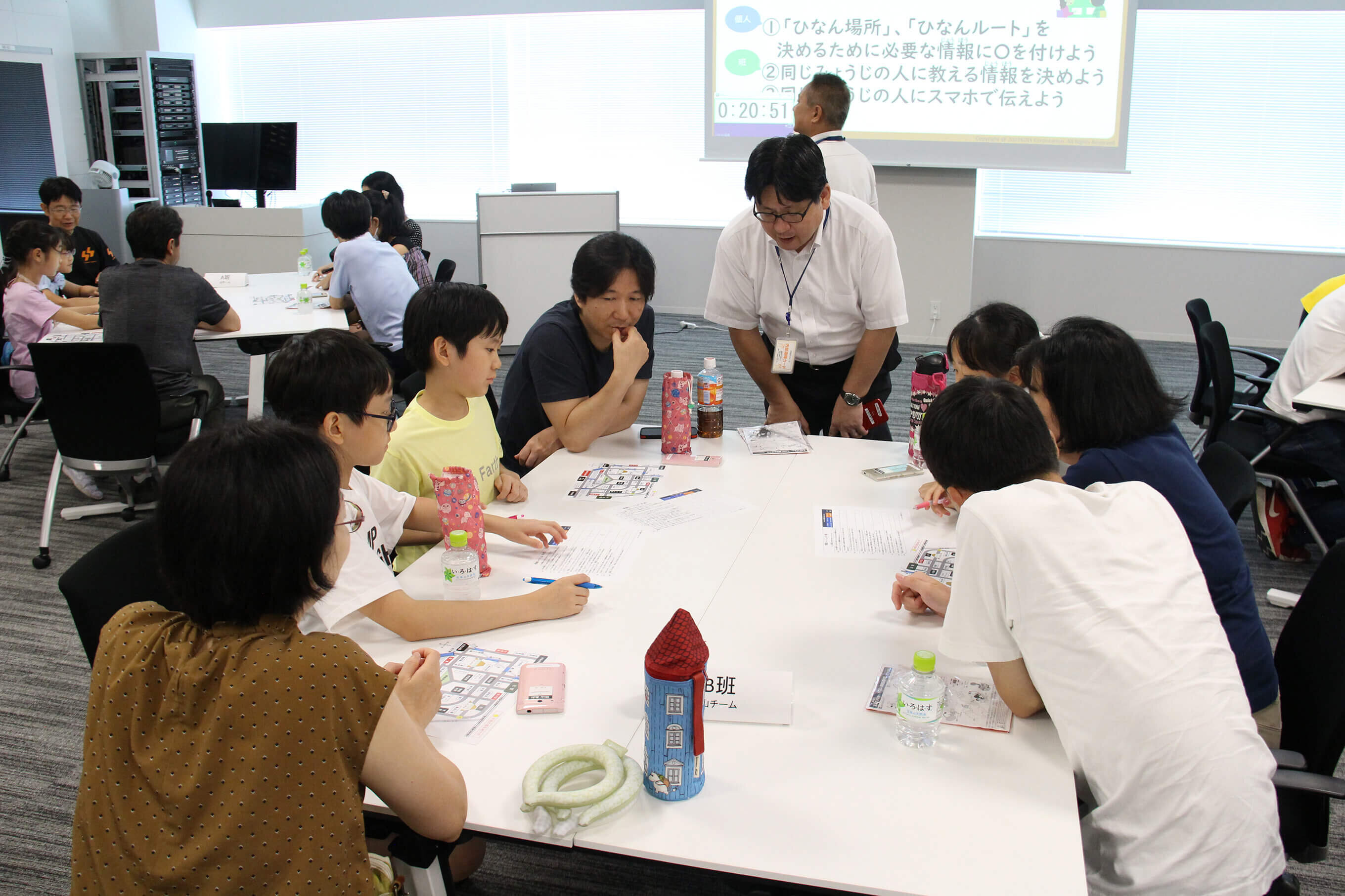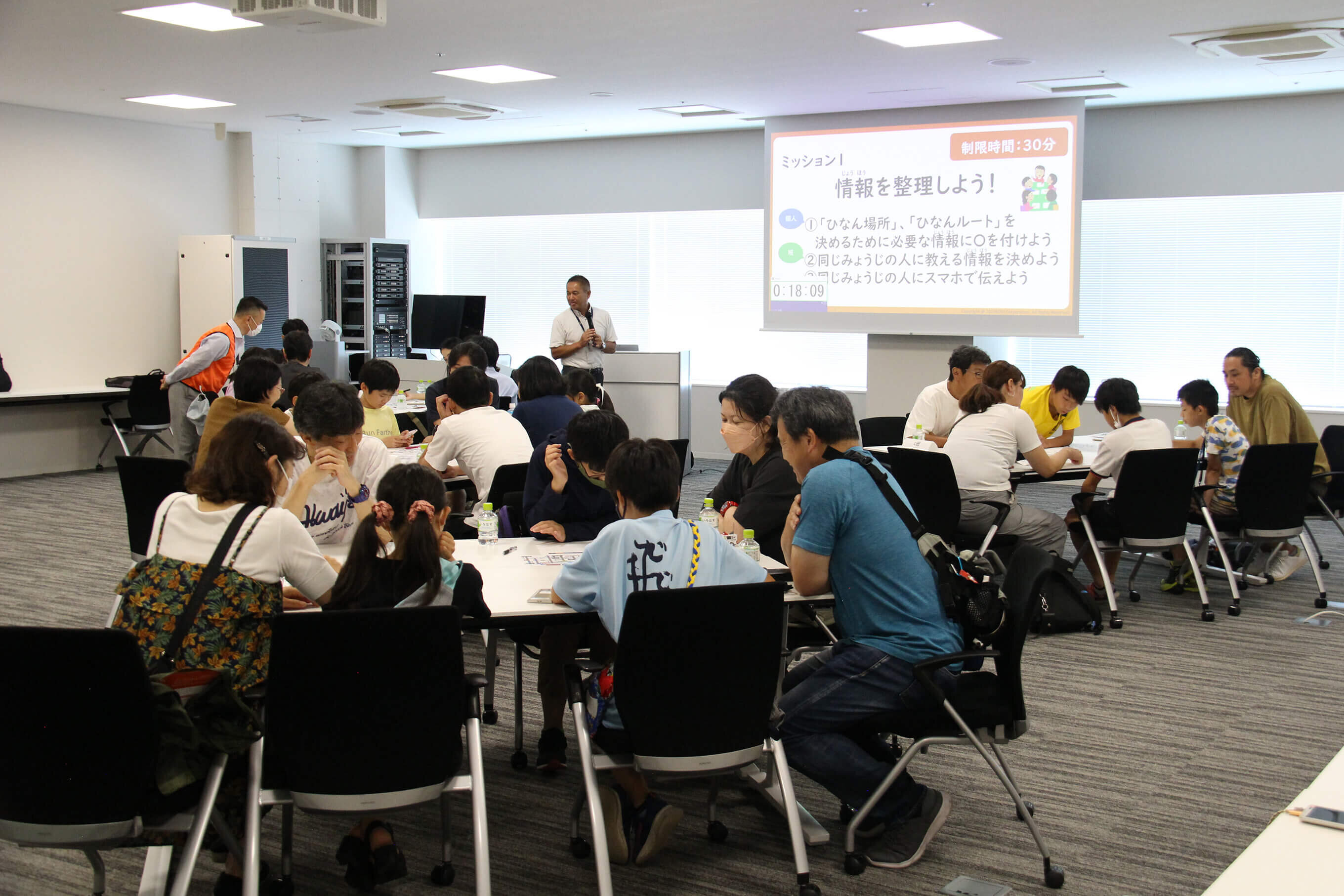 また、同日、ワークショップ「みんなで避難先を探せ! 親子で防災教室」を開催。高校生向けに開催されている「スマホde 防災リテラシー講座」を小学生向けに特別アレンジしたもので、参加した親子は大災害が起きたという想定のもと、複数の班に分かれて机上の地図・情報シートを見ながら、同じ班の仲間との対話や、専用グループチャットアプリを使用して離れた場所にいる家族から災害情報を集めて、安全な避難経路や避難所を特定するミッションに挑戦しました。