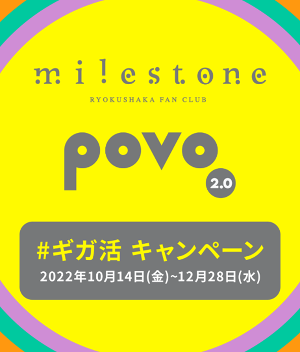 本手法活用の第1弾として、緑黄色社会のオフィシャル・モバイルファンクラブ「milestone」とpovo2.0「#ギガ活」キャンペーン (以下、本キャンペーン) を2022年10月14日 (金) から2022年12月28日 (水) まで実施します。