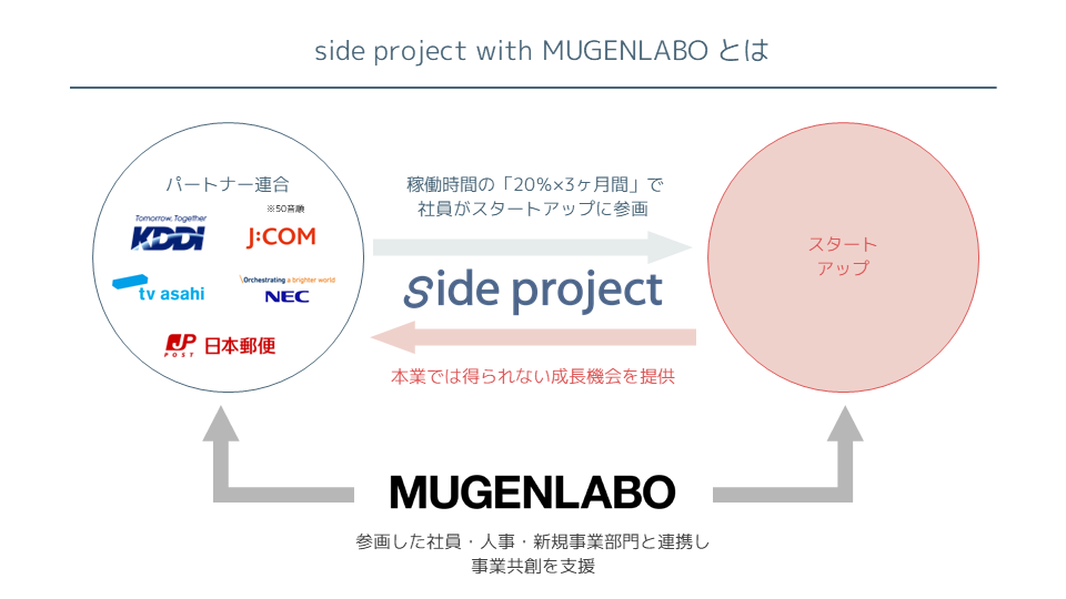 パートナー連合をはじめとした大企業の社員が3カ月間、就業時間の約2割を目安に、研修の一環としてスタートアップの業務に従事します。スタートアップは人手不足解消に加え、大企業の社員と関わることによる新たなアイディアと事業共創機会の創出が可能です。 - 大企業の社員は、スタートアップならではのスピード感のある業務を体験できるほか、既存業務の枠を超えた幅広い業務を通じ、俯瞰的な視野を習得することが可能です。