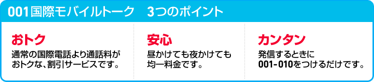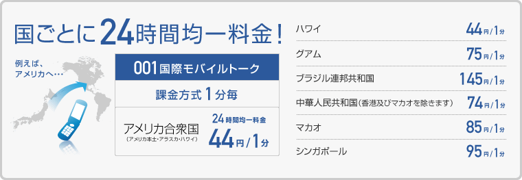 おトクな携帯電話割引サービス、001国際モバイルトークには登録料や基本料金など一切かかりません。使った分だけのご請求となります。あらかじめお申し込みいただくだけで、いざという時、安心して国際電話をご利用いただけます。