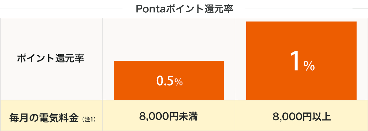 - 「でんきサービス」の月額ご利用料金のうち、基本料金(または最低料金)および電力量料金の合計金額(税抜)が対象となります。燃料費調整額、再生可能エネルギー発電促進賦課金は除きます。