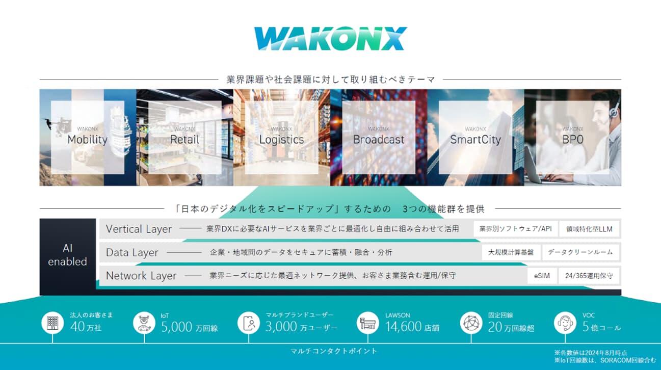 WAKONXの全体像を表したスライドを提示した野口は、「WAKONX」がモビリティ、物流、小売・流通、放送、スマートシティ、BPOという6つの業界課題・社会課題のテーマを掲げていることを紹介。そこで、「Network Layer」「Data Layer」「Vertical Layer」という3つのレイヤーで、ソリューションを提供していくと解説します。