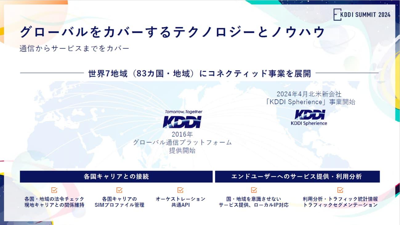 たとえば5,000万回線に達するKDDIグループ全体のIoT接続数のうち、半数以上の2,800万を占めるのがコネクティッドカーです。KDDIでは、グローバル通信プラットフォームとしてコネクティッドカーの世界展開を支援しています。世界7地域83カ国で展開し、通信からサービスまでカバーするさまざまなノウハウがKDDIの強みです。