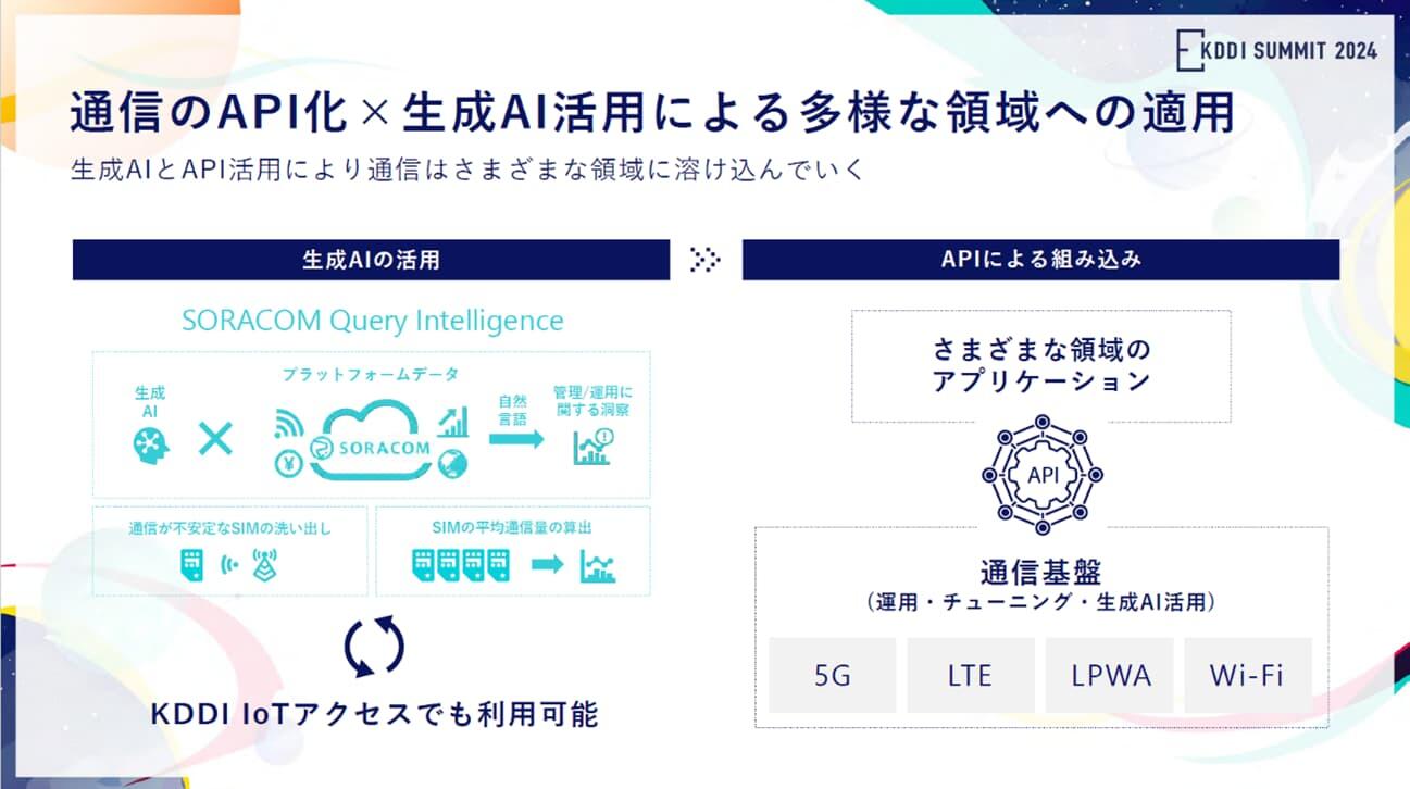 これまでは、熟練したスタッフによるオペレーションが物を言う場面もありましたが、現在はダッシュボード上でワンタッチ、ゼロタッチ操作など、自動化が進んでいます。そのなかで、すでにKDDI傘下のソラコムの基盤を用いたIoTでは、通信の不安定なSIMはどういったものか、とAIに質問すると教えてくれる仕組みが実現しています。野口は「通信機能をAPI化することで、幅広い領域に組み込みがしやすい通信基盤へと進化させています」と聴衆に語りかけました。