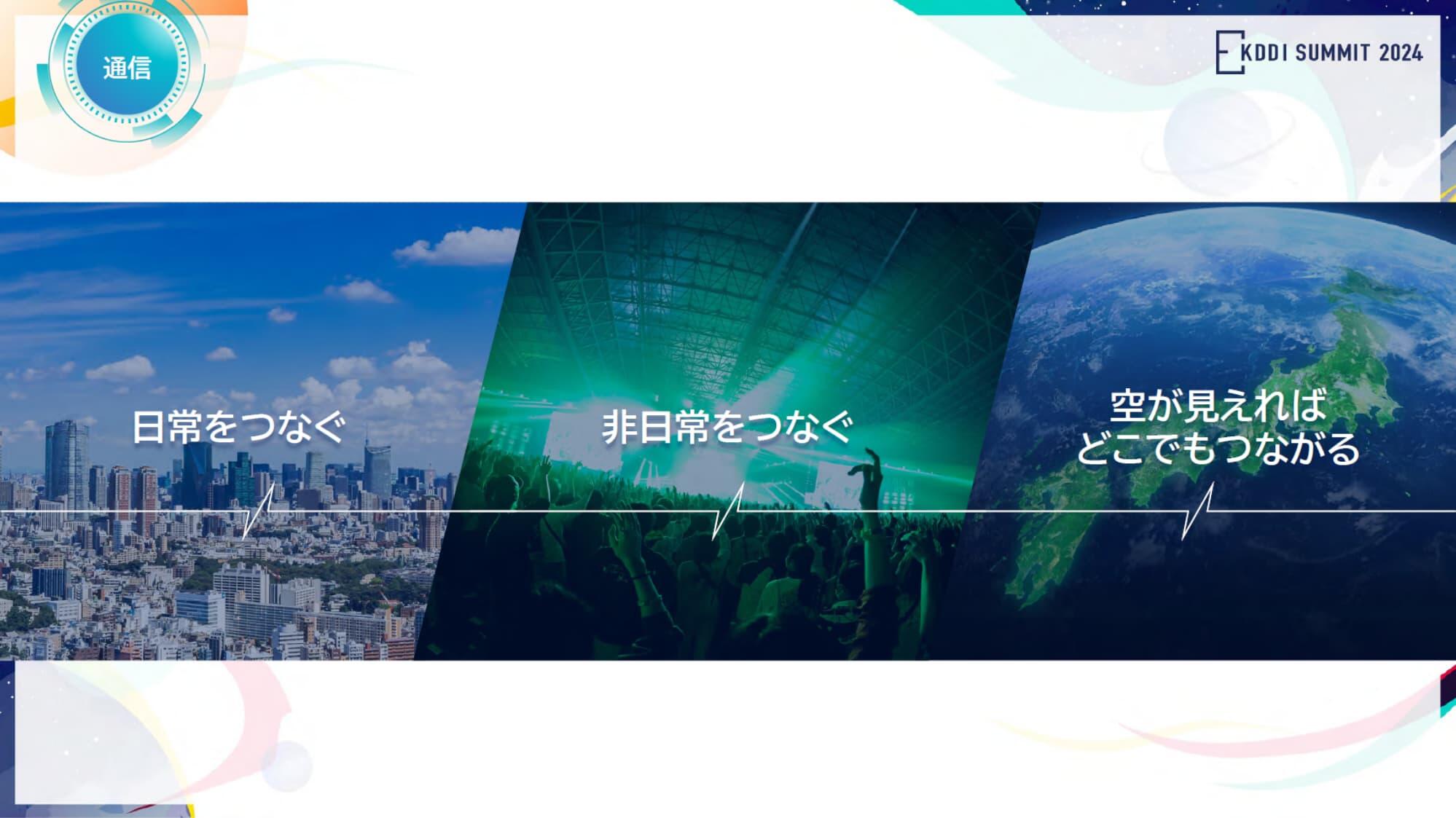 KDDIは、「日常をつなぐ」「非日常をつなぐ」「空が見えればどこでもつながる」の3つ軸を掲げ、お客さまの生活動線を中心にエリアを構築し5G(Sub6)基地局数で国内No.1、山小屋や音楽フェスなどのつながりにくい場所の対策を進めています。2024年内には、Starlinkでの直接通信サービス開始を目指し、日本のどこにいても、空が見えればつながるように対応を進めています。
