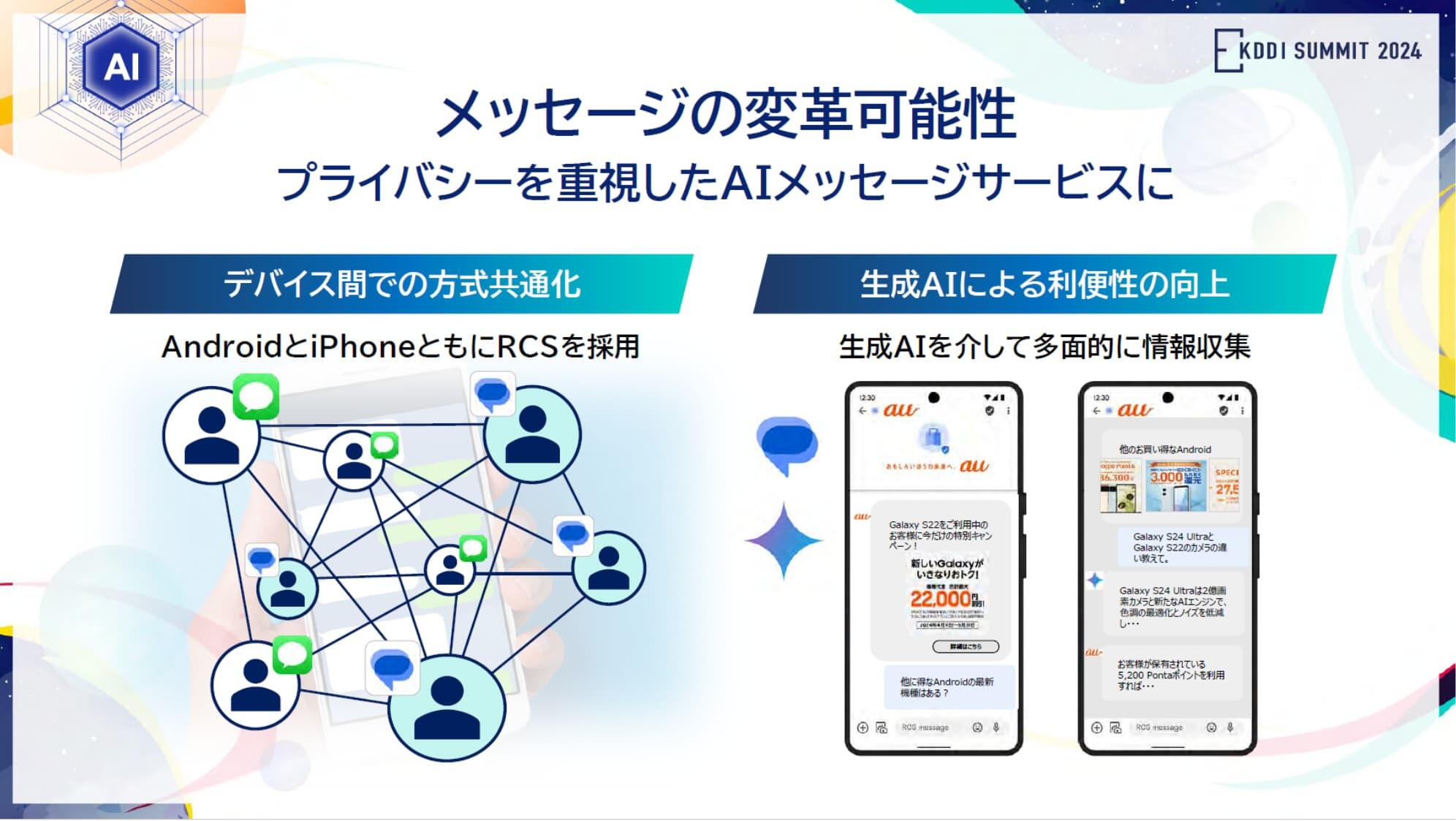 「AIで変革できる動きとして、iPhoneとAndroidで、RCS方式でメッセージのやり取りができるようになります。メッセージサービスはプライバシーが大切であり、プライバシーを重視したAIメッセージサービスを展開したい。たとえば、お客さまがauオンラインショップとやり取り場面では、AIが万能コンシェルジュとして提案してくれるなど、多面的な情報収集ができるUIができるという期待もあります」