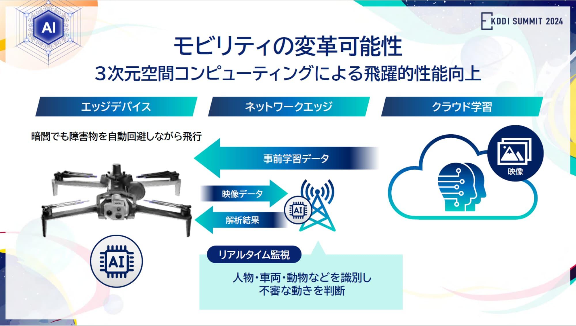 一例として挙げられたドローンでは、周囲に何があるのか学習する必要がありますが、膨大なデータをドローンに格納しつつ、内蔵するAIチップで、パターンを解析して障害物を回避できるようにします。さらに、ドローンが取得したデータをネットワーク側に戻して、学習を深めるわけです。
