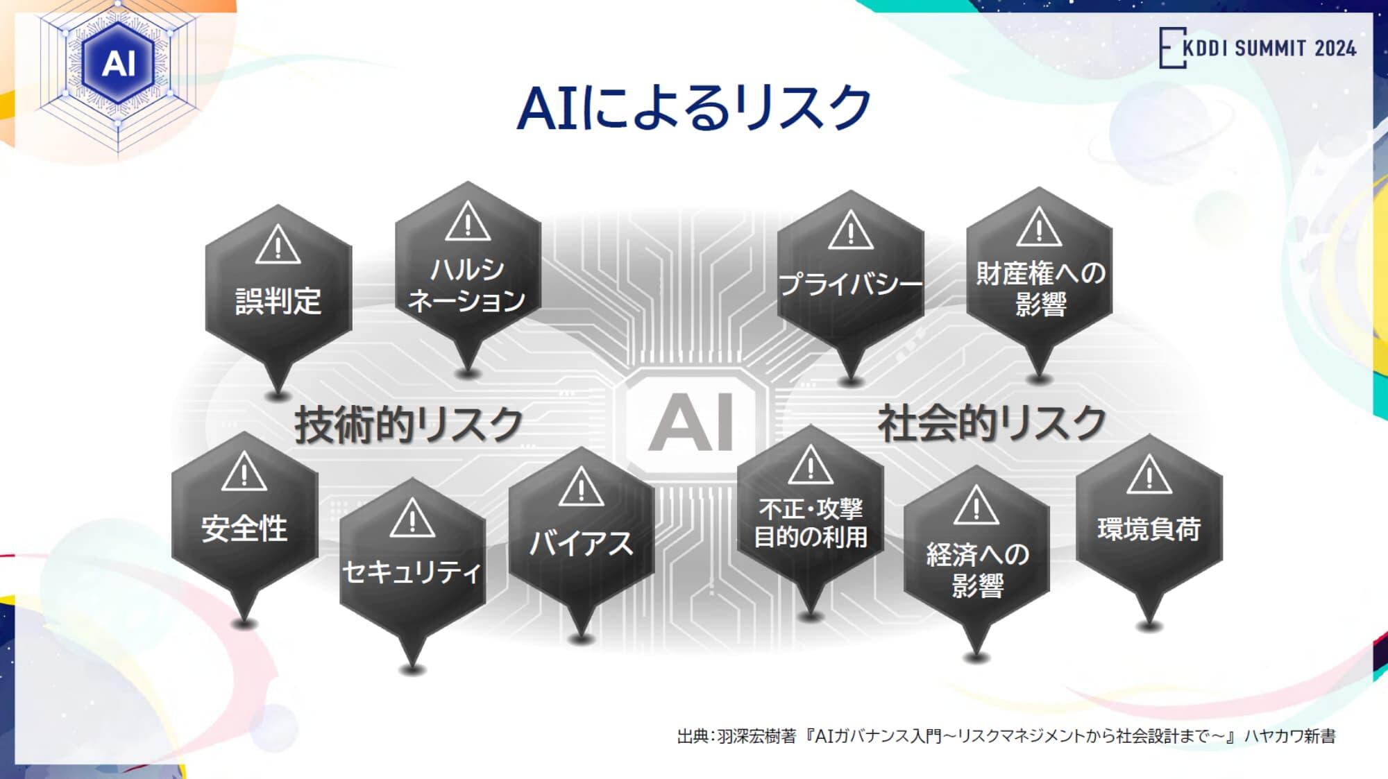 松田は、一般的にAIには技術的リスクと社会的リスクがあり、プライバシーや著作権、財産権、ハルシネーションへの懸念から、AIの導入に二の足を踏んでいる人もいると説明した上で、権利の侵害やなりすましなどには国と協力して対策を進めるなど、安心・安全なAIを目指す方針をあらためて紹介し、KDDIとして不安を取り除き、導入企業に寄り添いながらAIの上手な活用を進めるとしました。