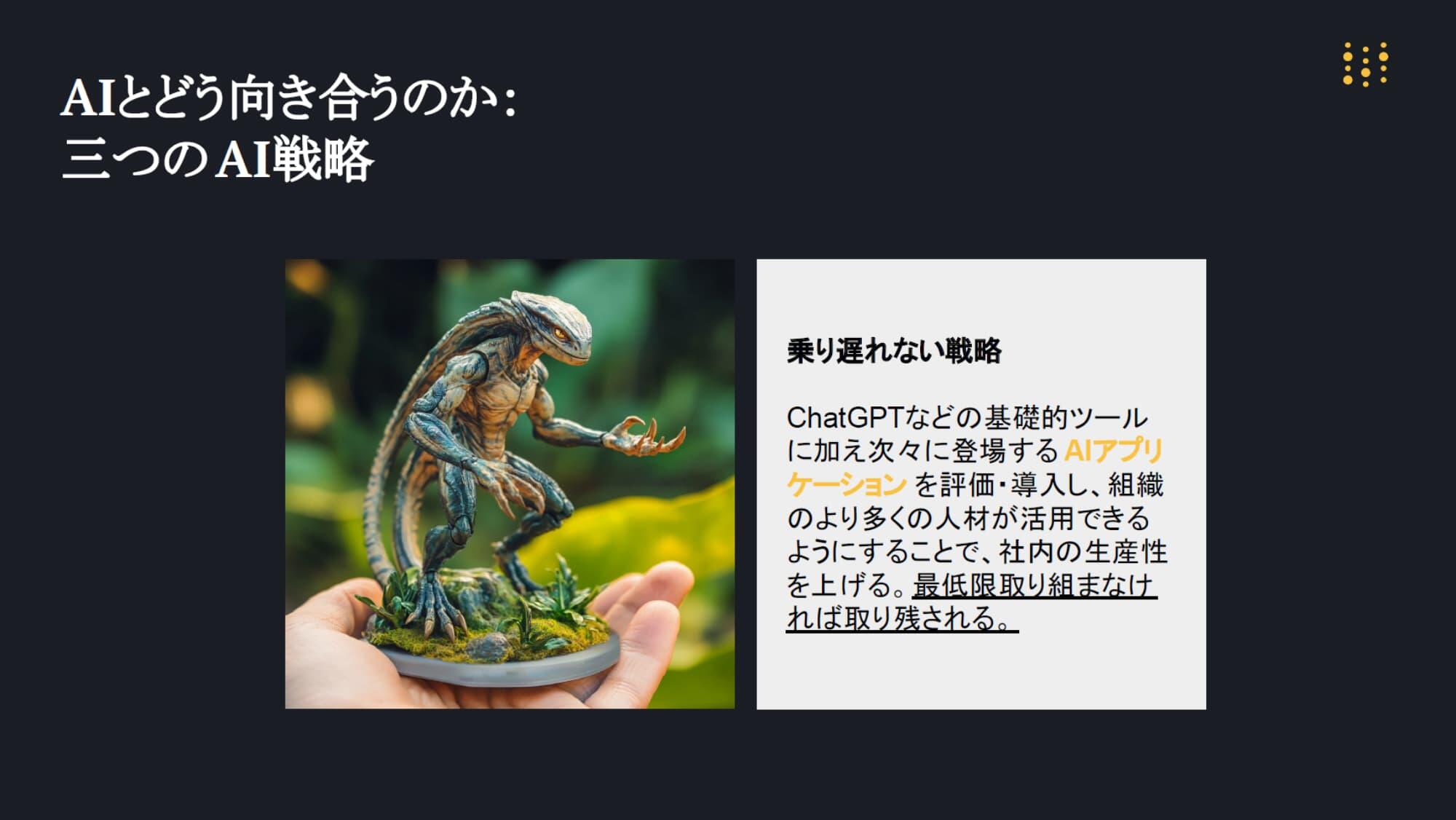 1つ目は、乗り遅れないこと。現時点で、すぐに試せるアプリケーションがあり、どう活用し、どう生産性を上げるかという点は、最低限取り組むべきと説きます。