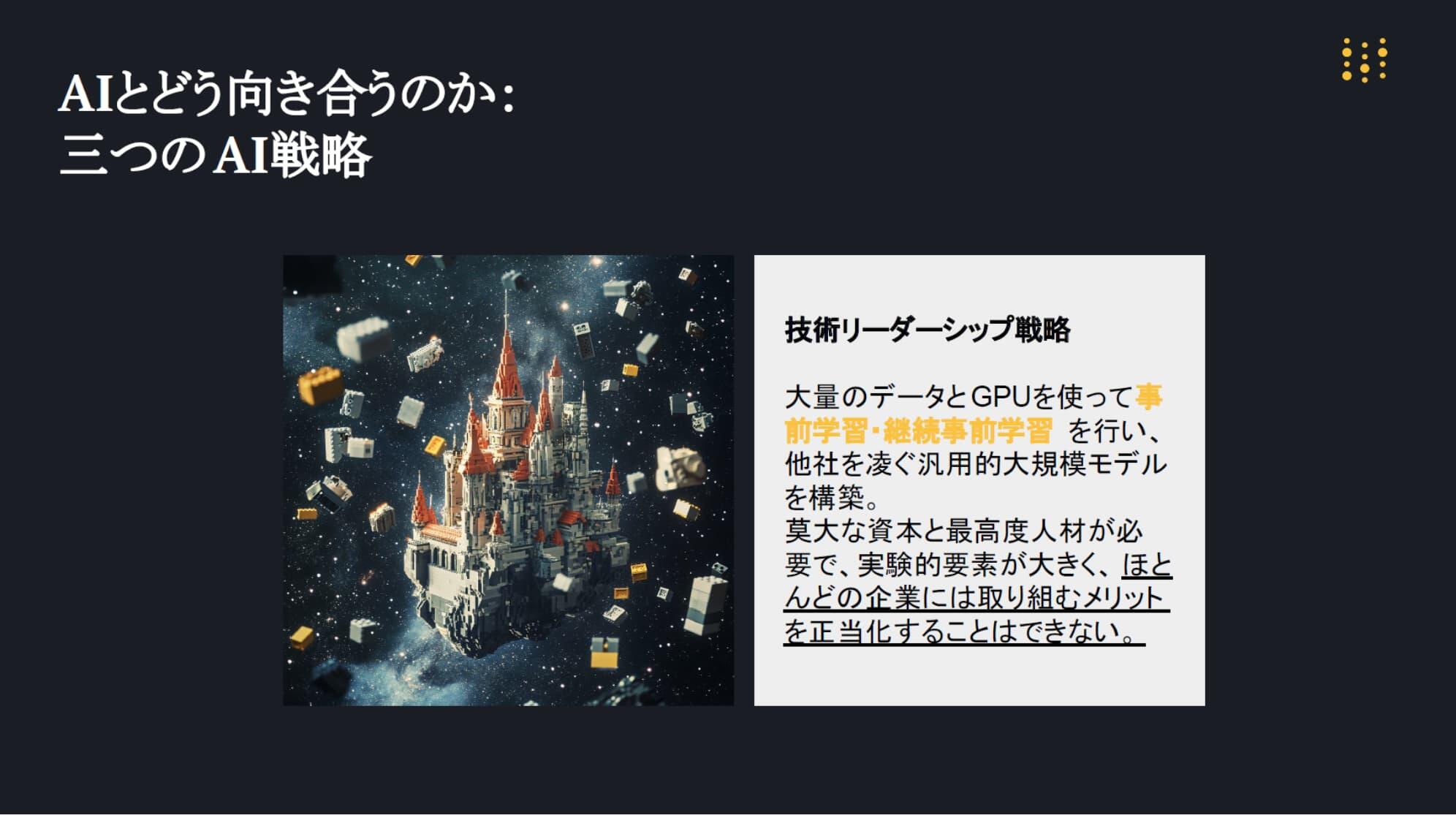 2つ目は、技術リーダーシップ戦略です。多くのデータと処理基盤(GPU)を使い、大規模な生成AIモデルを自社で開発すること――ですが、莫大な資本と技術人材が必要であり、ほとんどの企業では、この戦略を成立させるのは、難しいかもしれません。