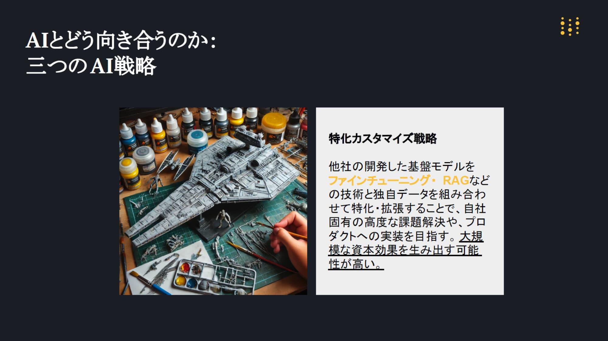 そこで3つ目の戦略として紹介されたのが、特化カスタマイズ戦略です。今ある技術を、自分たちの目的のためにカスタマイズして使うというもの。シバタ氏は「特化された用途にチューニングされれば、その用途では汎用的なモデルに勝る性能を得られます。これが、投資対効果が大きくなる可能性のある重要な戦略ではないか」と述べます 。