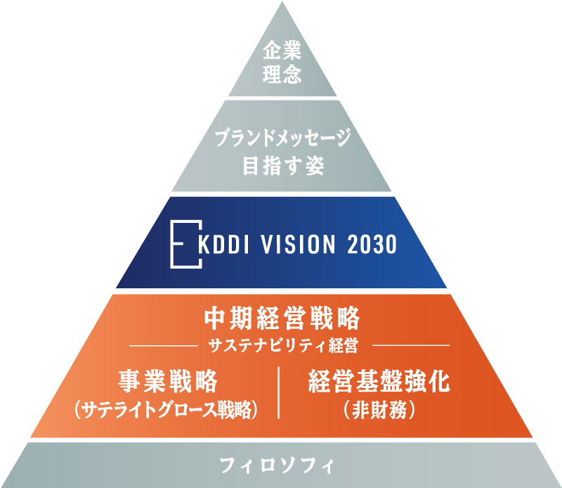 KDDIの中期経営戦略フレームワークは三角形の図で表されており、そのベースにはKDDIフィロソフィがあります。フィロソフィを構成するひとつの要素として、当社は、「心を高める」~動機善なりや、私心なかりしか~という社是を掲げています。この社是は、企業人である前にまず人間として何が正しいのかを問うものであり、個人の利益や都合で考えるのではなく、その動機が普遍的に良いこと、すなわち善であるかどうかを常に判断基準とすることを示しています。