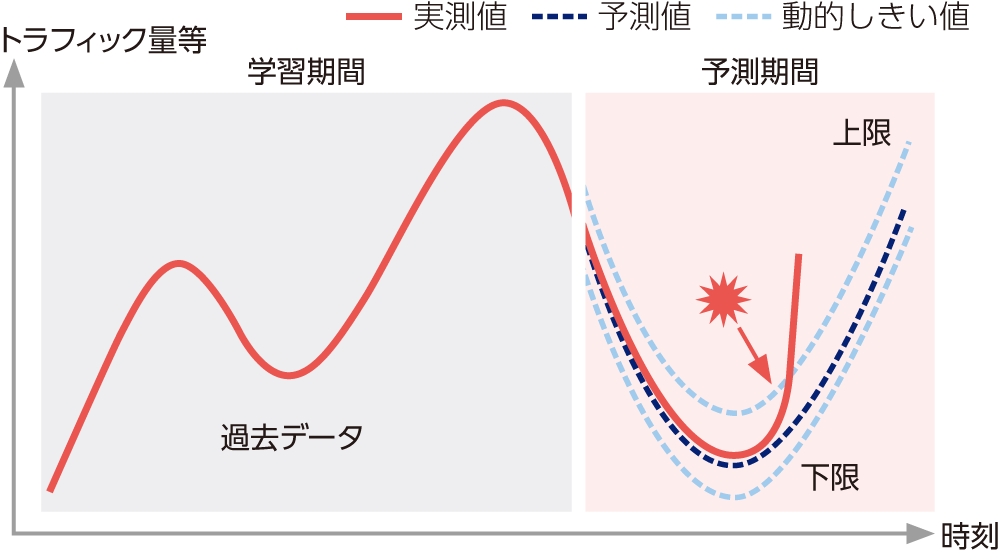 AIで複雑な基準値を動的に作成することで(動的しきい値)、時間帯や平日・休日などの違いで値が大きく変動するパターンの障害検知を実現