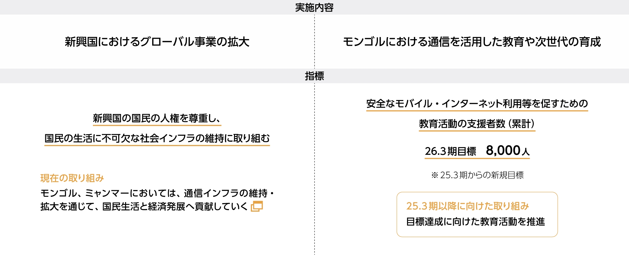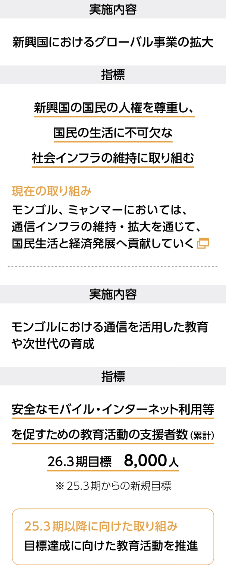 海外新興国にて通信と周辺サービスの維持拡充を図り、現地の経済発展に貢献することで、地域・経済格差を解消する