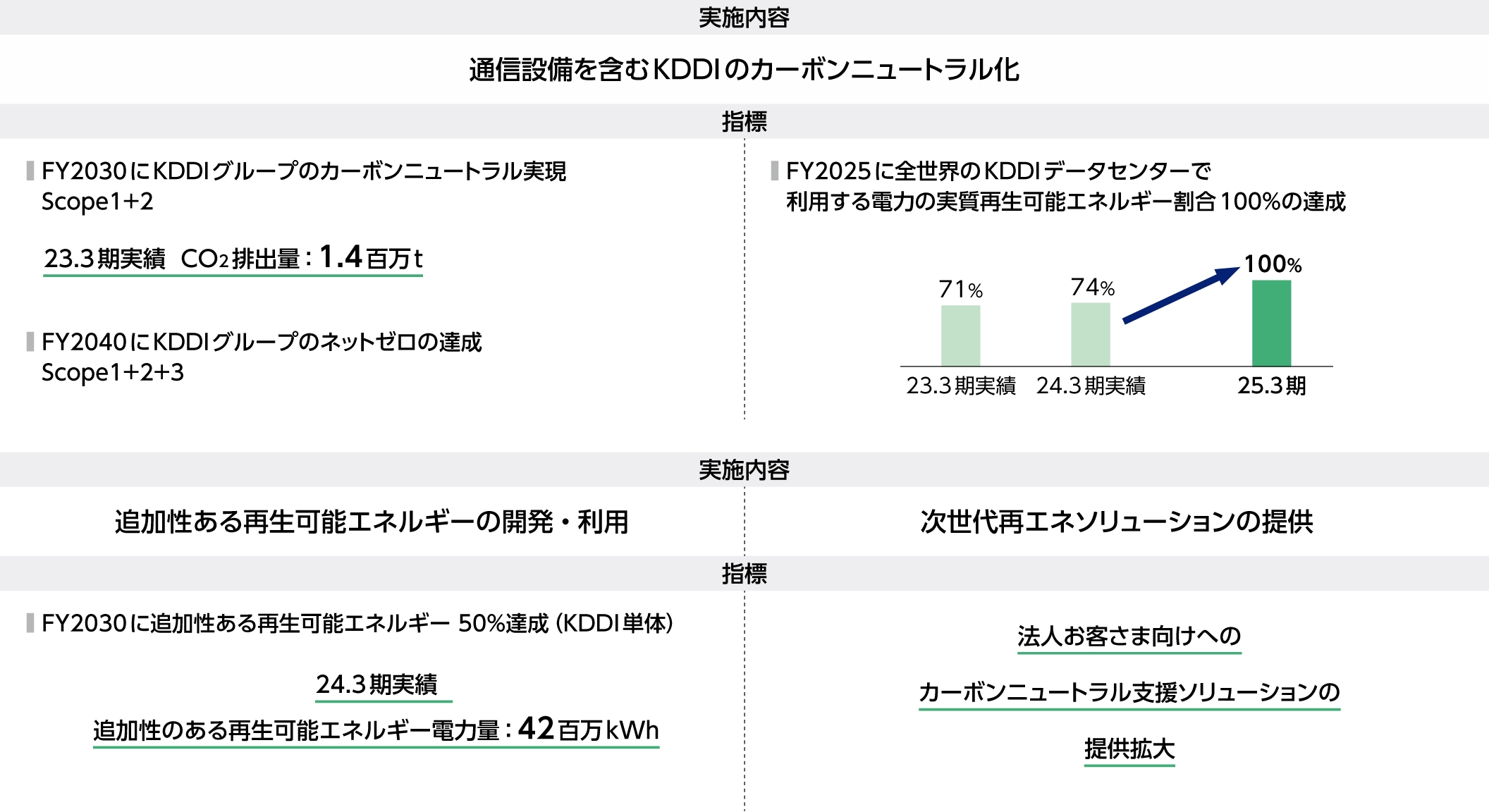 KDDIは、2024年5月に発表した中期環境保全計画「KDDI GREEN PLAN」において、自社の使用する電力量のうち2030年度までに追加性ある再生可能エネルギーを50%以上導入することを定めています。今後も太陽光などの再生可能エネルギー発電設備の建設を推進し、再生可能エネルギーの導入を拡大することで、カーボンニュートラル実現に向けた取り組みを加速していきます。