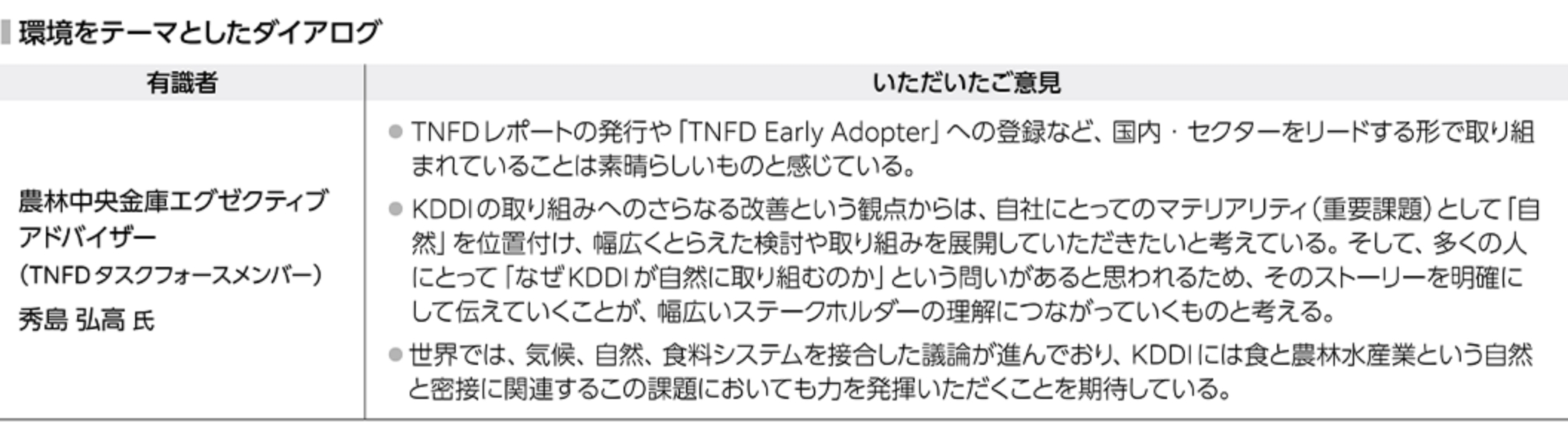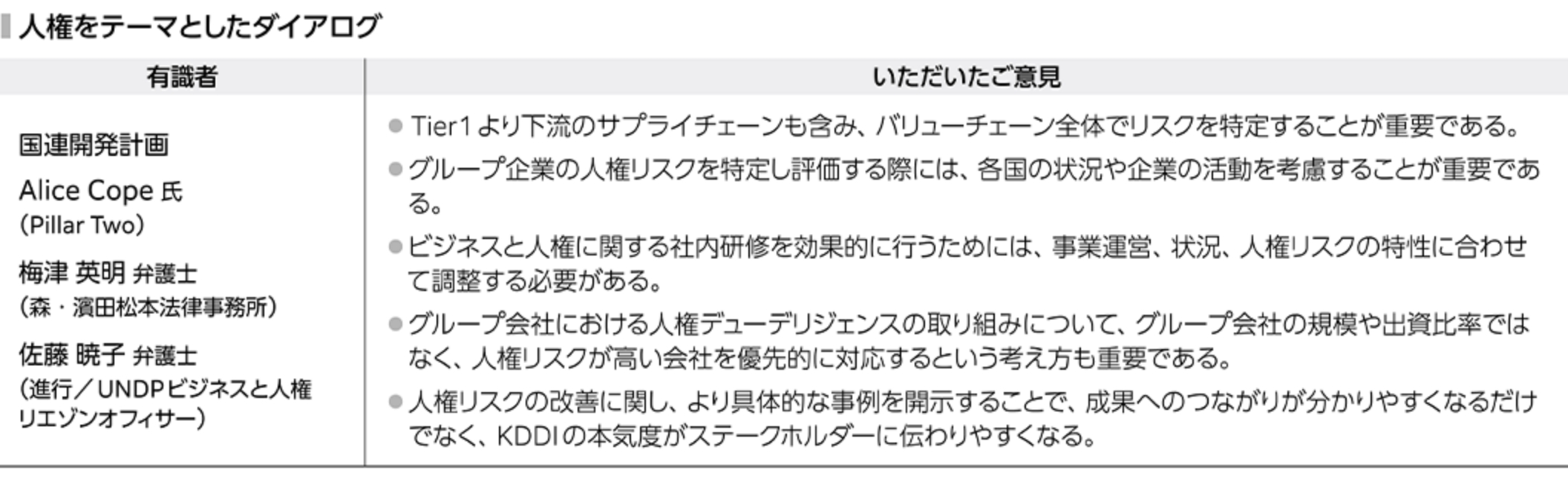 KDDIは、ステークホルダーの皆さまのご意見・ご要望を経営に取り込み、改善する活動を積極的に実施しています。24.3期は、環境と人権をテーマとし、KDDIの取り組みへの評価と今後の期待をうかがうステークホルダーダイアログを実施しました。
