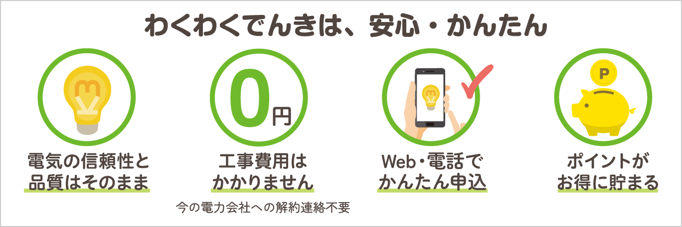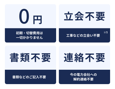 - 本でんきサービス切替えに伴う、初期費用、工事立ち合い、申し込み書類は不要です。
