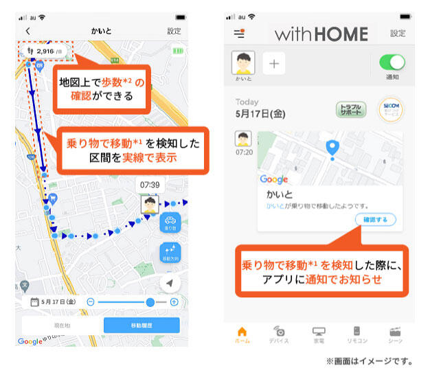 - 電車やバスなどの乗り物(*1)に乗っていることを検知した時にアプリへお知らせ/歩数(*2)も確認できます。
